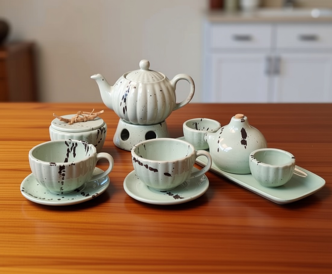 هر جزء از این ست، از قوری گرفته تا فنجانها و نعلبکیها، با دقت و ظرافتی کمنظیر ساخته شدهاند. طراحی منحنی و لعاب مات با لکههای تیرهی نامنظم، به هر قطعه روحی خاص بخشیده؛ گویی هر فنجان داستانی از صبحهای آرام و دلنشین در دل خود دارد.