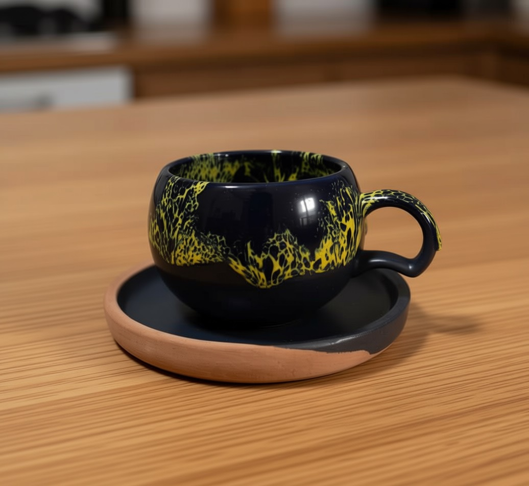 اگر به‌دنبال یک ماگ خاص، چشم‌گیر و متفاوت هستید، این ماگ فانتزی کیوت می‌تواند به زیباترین شکل ممکن سلیقه‌ی شما را نمایان کند. این ماگ سرامیکی دست‌ساز با ترکیب رنگ مشکی عمیق و بافت زردِ جذاب، جلوه‌ای هنری و منحصربه‌فرد ایجاد کرده که در همان نگاه اول توجه را به خود جلب می‌کند. لعاب براق و نقوش طبیعی پخش‌شده روی بدنه، باعث شده هر قطعه هویت خاص خودش را داشته باشد و شما صاحب یک اثر کاملاً یکتا شوید.
